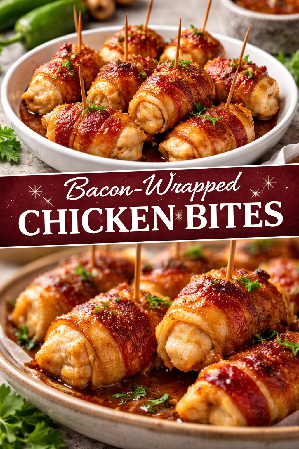 Picture a long wooden table, a playlist humming softly, and a platter piled high with Bacon-Wrapped Chicken Bites. Pair them with: