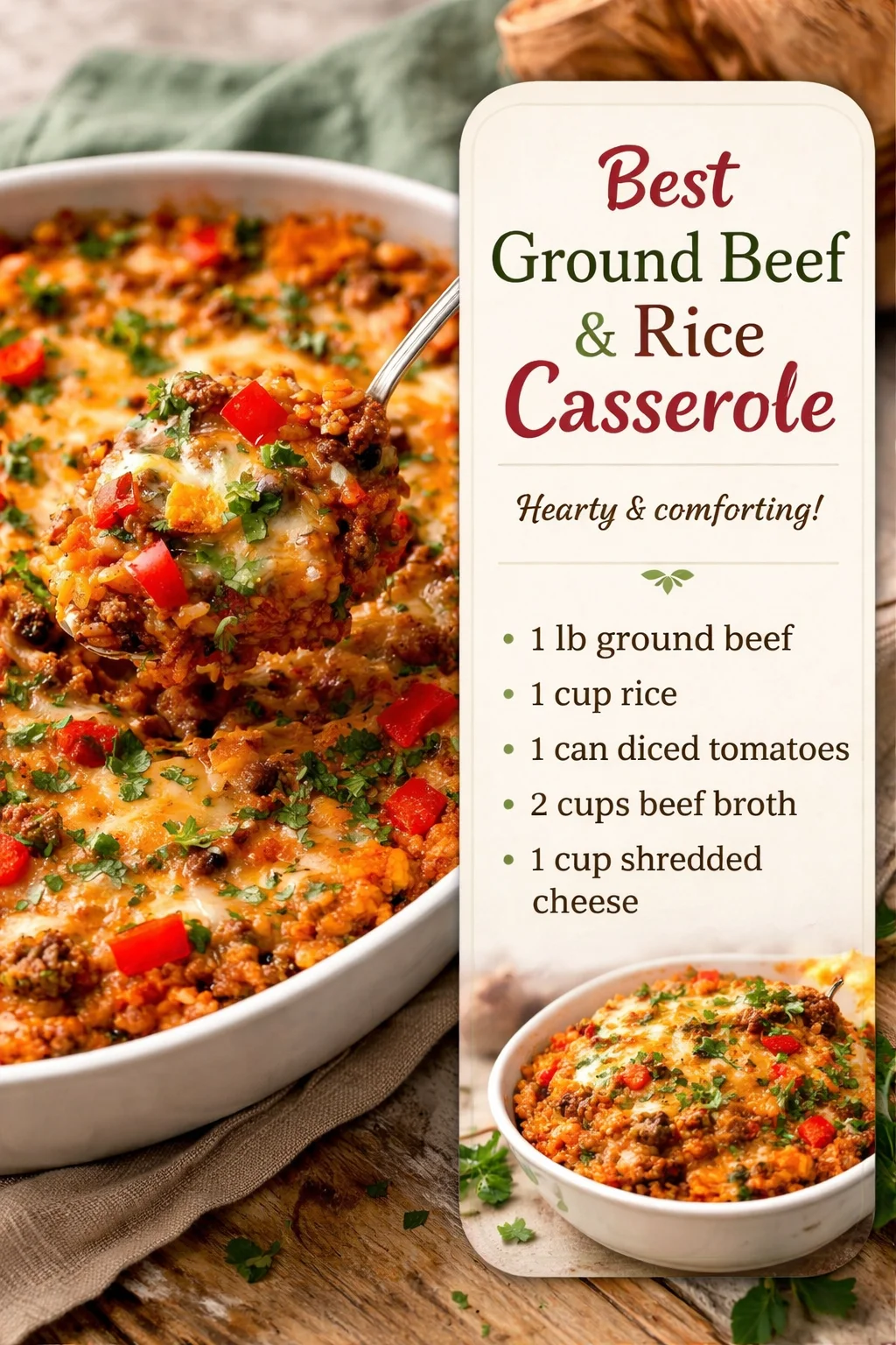A comforting casserole made with ground beef, fluffy rice, and melted cheese, perfect for family dinners and quick weeknight meals.