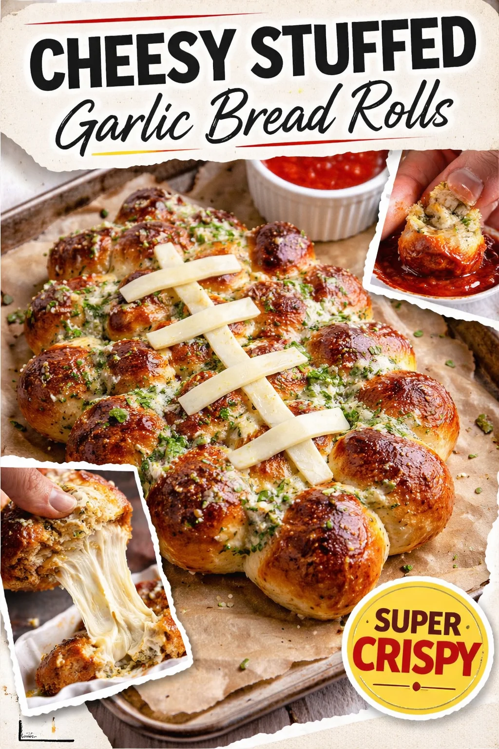 Cheesy Stuffed Garlic Bread Rolls are small packages of joy—warm, indulgent, and welcoming. They make ordinary nights feel celebratory and turn simple ingredients into a memory-making meal. Try them tonight, tweak the fillings to your heart’s desire, and let the aroma draw everyone to the table. If these rolls become part of your rotation, I promise you’ll smile every time the oven door opens. Share them, savor them, and keep making cozy moments one pull-apart bite at a time.