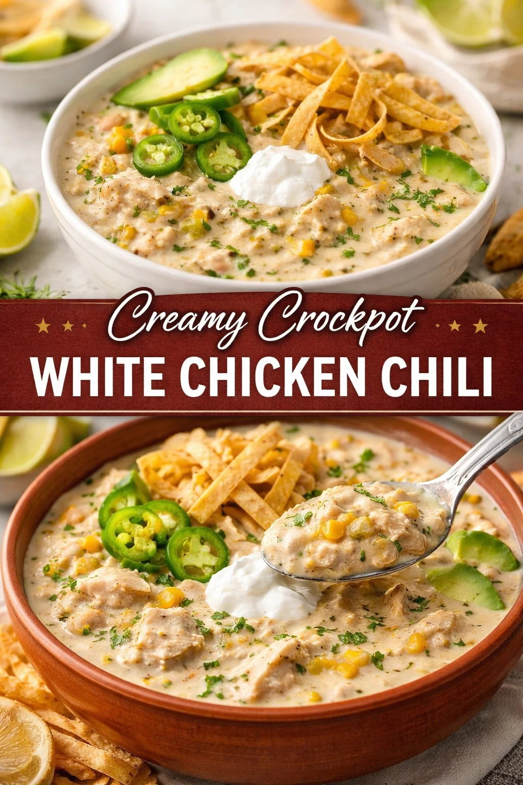 Picture bowls of steaming Creamy Crockpot White Chicken Chili set in the center of the table. Serve with crunchy tortilla chips for scooping, a bright green salad to balance the richness, or cornbread studded with honey butter. For drinks, a crisp lager or a sparkling citrus mocktail complements the lime and creamy textures. This dish shines at family dinners, casual potlucks, and chilly fall gatherings where everyone wants to feel warm and welcome.