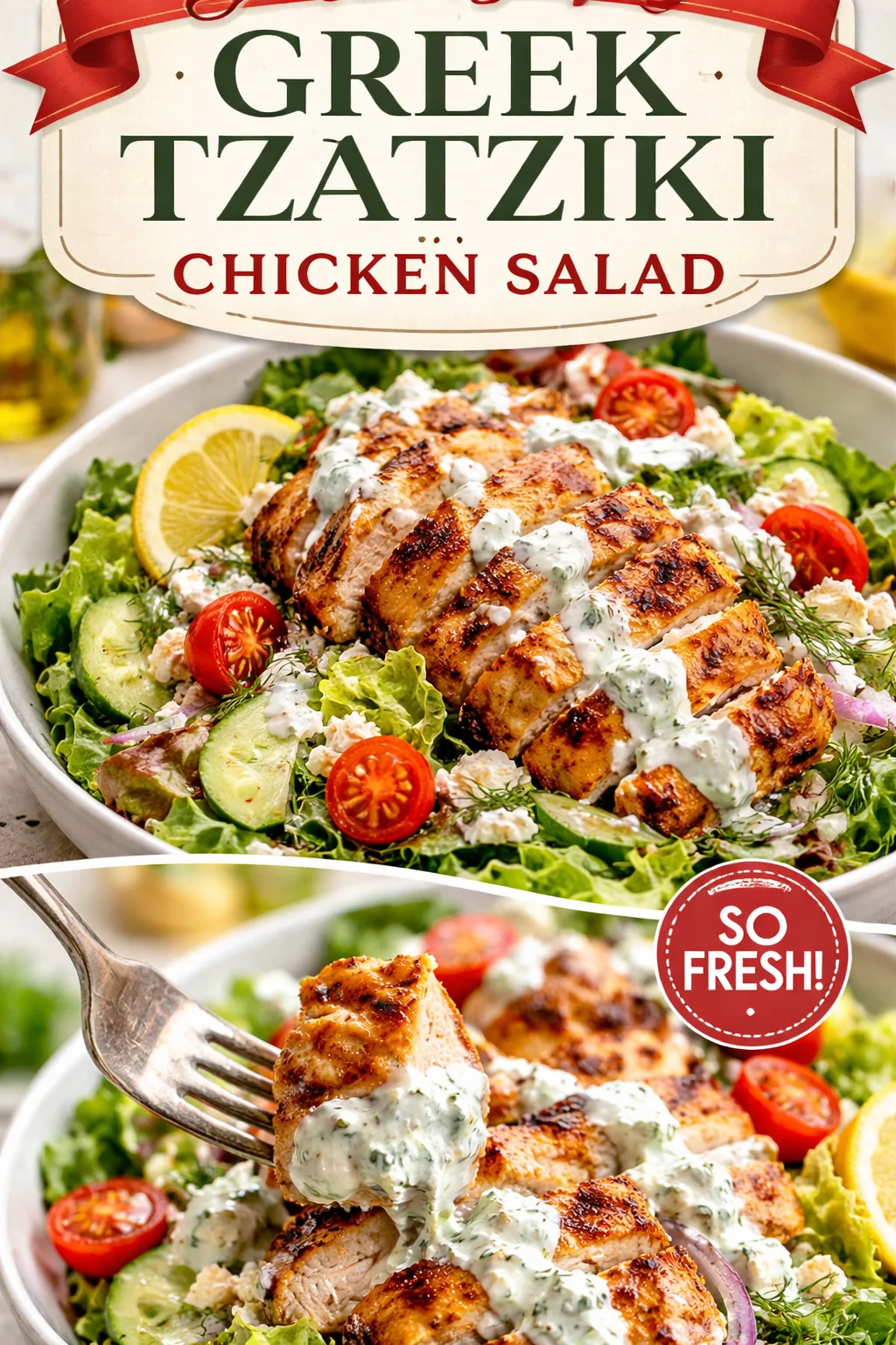 This salad shines at any table. Serve it on sunny weekend brunches with a chilled glass of white wine or sparkling water. For a casual weeknight: pair with warm pita and roasted potatoes for a cozy, comforting meal. For festive gatherings: place the chicken on a platter with bowls of tzatziki, olives, and lemon wedges so guests can assemble. Imagine laughter, shared plates, and those crisp bites disappearing first — that’s the memory this dish creates.