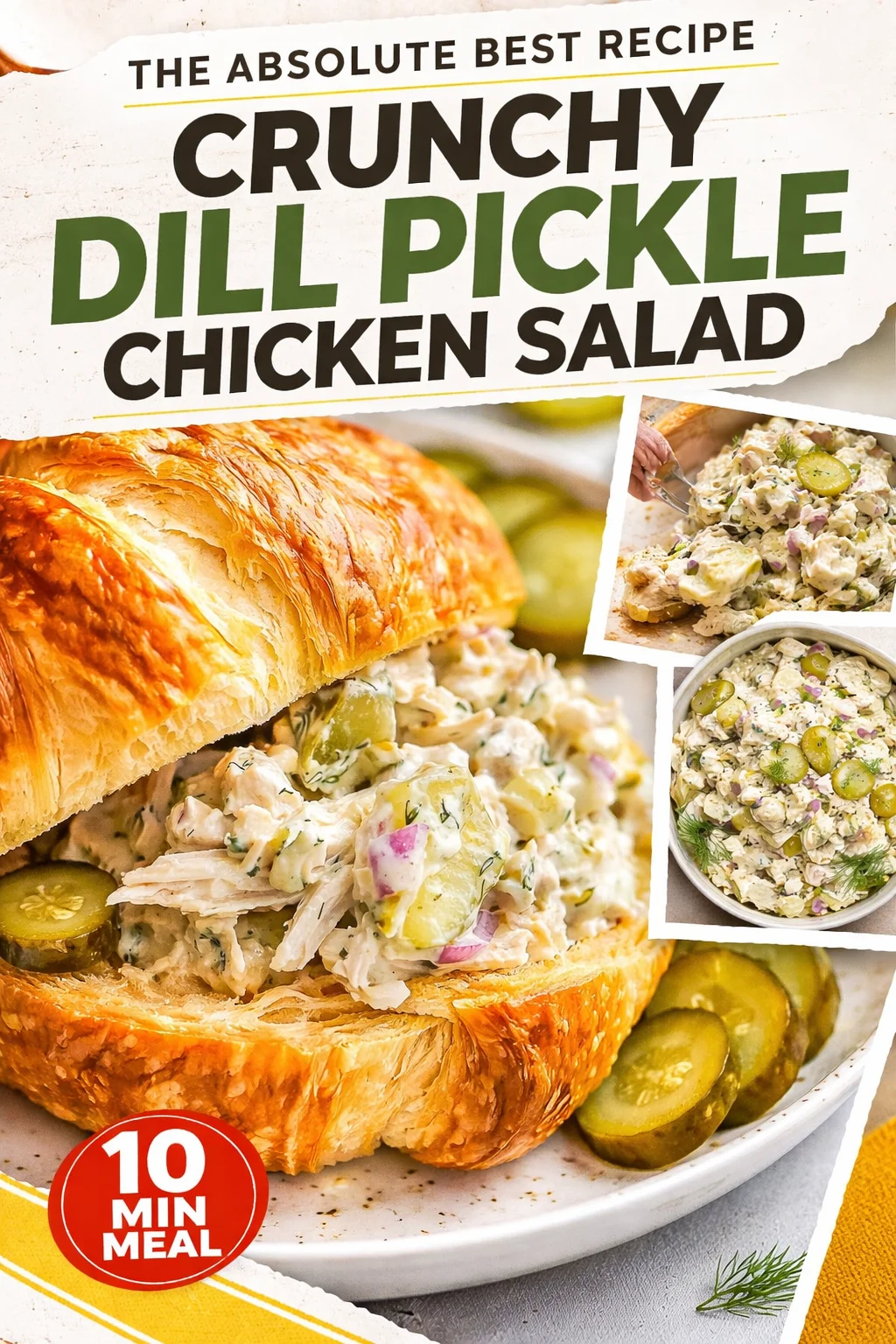 A tangy, cozy chicken salad featuring bright dill pickles, creamy yogurt, and crunchy vegetables, perfect for sandwiches, snacks, or picnics.