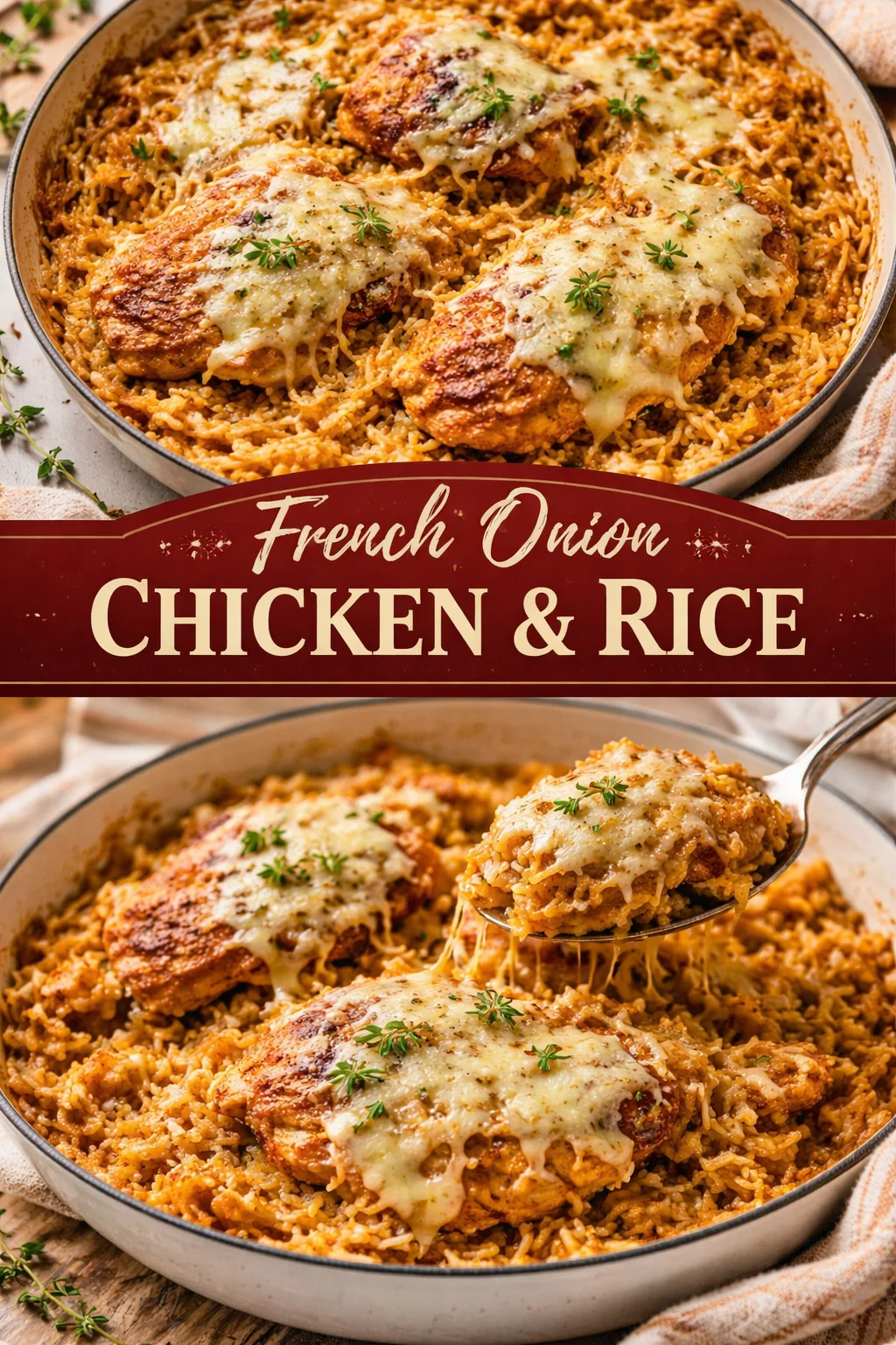 For a creamy contrast, try a related take on the theme like the creamy French onion chicken orzo casserole, which highlights the same flavors with orzo instead of rice.