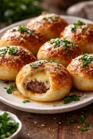 Garlic Parmesan Cheeseburger Bombs are more than a recipe — they are a small, joyful ritual that fills your home with savory warmth and invites people to linger. They turn simple ingredients into a comforting food moment that becomes tradition: a quick dinner idea for busy nights, a family favorite for celebrations, and a crowd-pleasing appetizer when guests arrive. If you want to peek at a similar inspiration or the original idea that sparked this cheesy little miracle, check out the original Garlic Parmesan Cheeseburger Bombs recipe on Pitmaster Club. Try them tonight, and let the buttery, garlicky goodness become part of your happiest table memories.