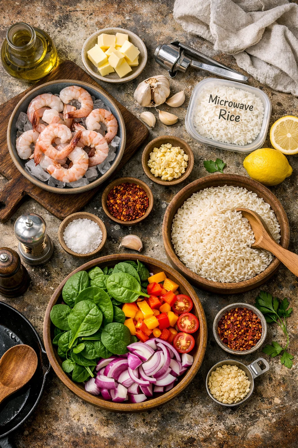 Shrimp cooks crazy fast. I sauté it in butter with garlic, a pinch of chili flakes, and finish with lemon. Serve it over microwavable rice or quick cooking jasmine rice. Add a handful of spinach at the end so it wilts right in.