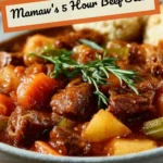 Serve Mamaw’s 5 Hour Beef Stew in deep bowls with a crusty baguette for sopping, or over creamy mashed potatoes for a stick-to-your-ribs dinner. Pair with a simple green salad and a robust red wine for adult gatherings, or pour into thermoses for a cozy picnic. Picture a long table, kids with napkins tucked in, and bowls shared between laughter and stories — that’s what this meal invites.