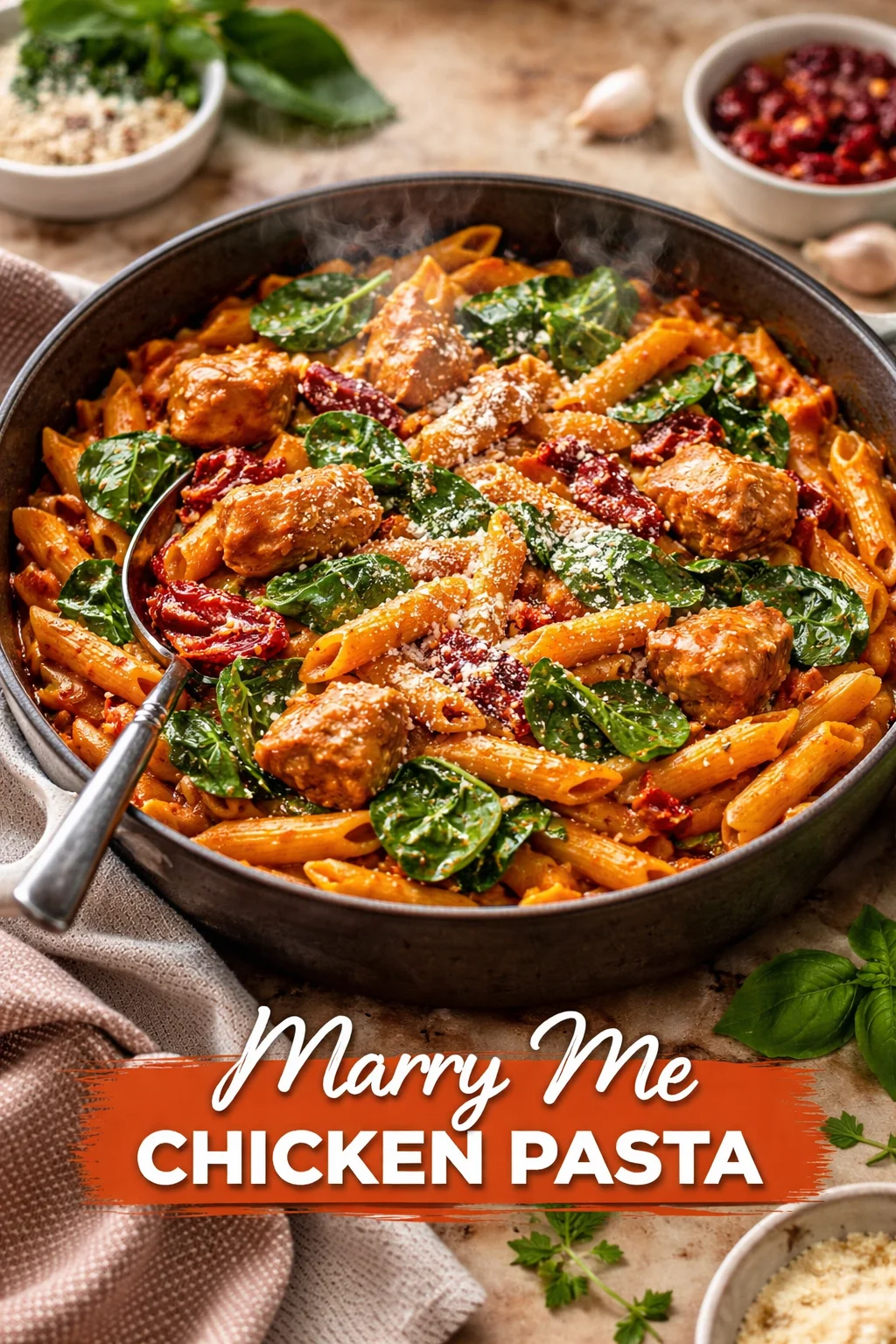 Serve Marry Me Chicken Pasta steaming in large shallow bowls so every forkful gathers sauce, chicken, and a ribbon of pasta. Pair with crusty bread to mop up the sauce and a bright salad of arugula, lemon, and shaved Parmesan to cut the creaminess. For drinks, a chilled Pinot Grigio or a citrusy mocktail lifts the dish; for a cozy night in, a glass of full-bodied red complements the tomato and Parmesan notes. Picture a warm table, soft music, and laughter — that is how this meal shines.