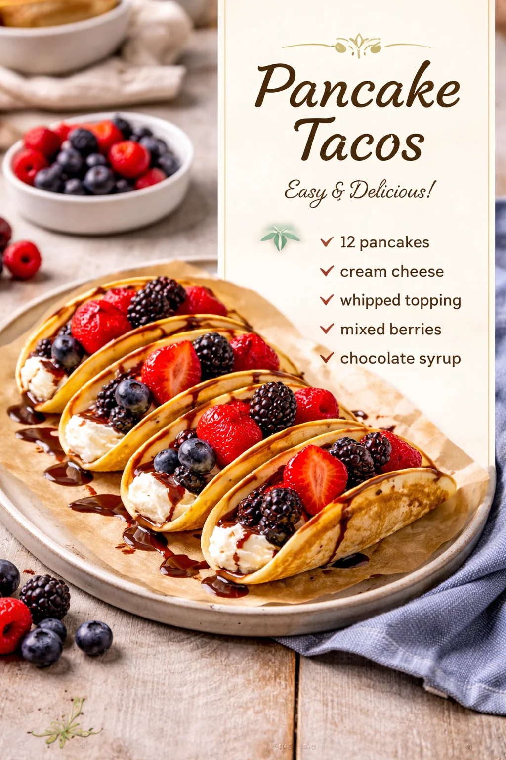 - Optional toppings: Fresh fruit, whipped cream, nut butter, or scrambled eggs to stuff your tacos!