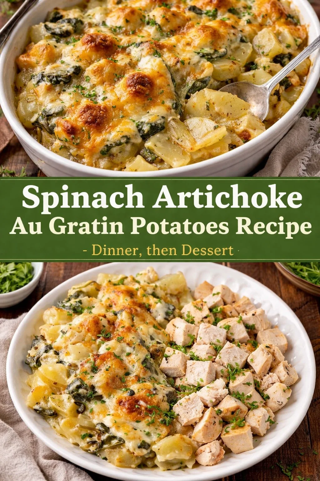 There’s something profoundly comforting about gathering around a dinner table, especially when a warm, indulgent dish finishes baking and fills the room with savory aromas. I can still recall my family’s take on cozy evenings, where laughter mingled with the scent of melted cheese and roasted vegetables. Enter the Spinach Artichoke Au Gratin Potatoes Recipe – Dinner, then Dessert. This dish is not just a feast for the eyes; it’s a warm hug on a plate, combining the rich flavors of spinach and artichoke in a cheesy, creamy bath that hugs tender potatoes. Whether it’s a weeknight dinner or a festive meal, this recipe will soon make its way into your heart and kitchen.