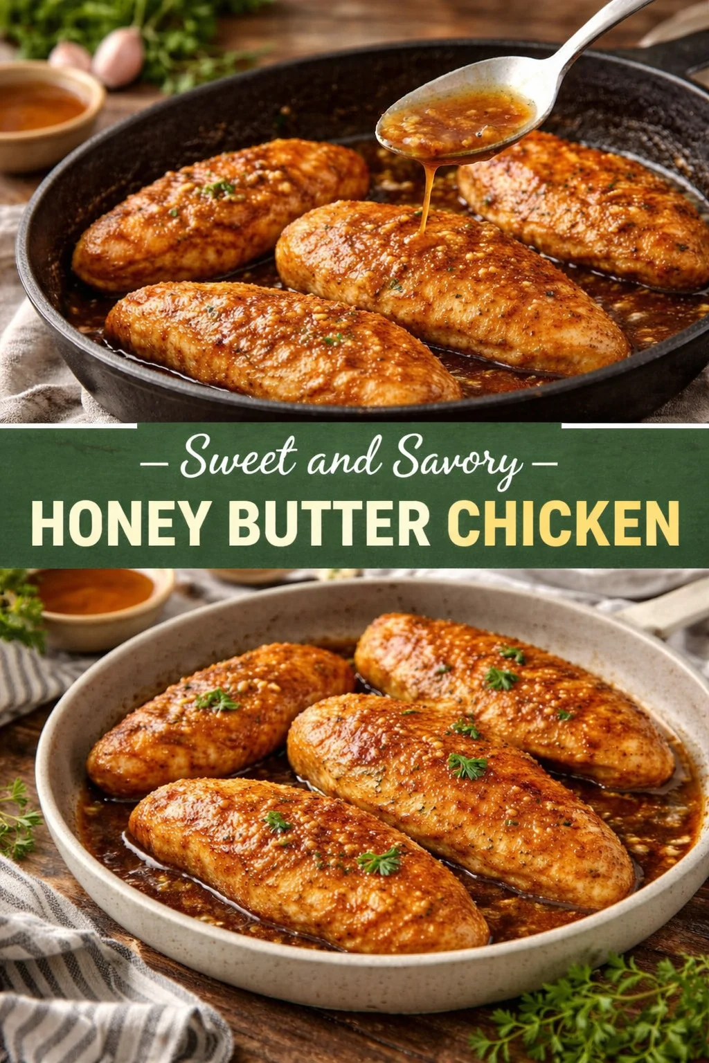 - Create the Glaze: Remove the chicken from the pan and set aside. In the same skillet, add the remaining butter and honey, stirring until well blended.