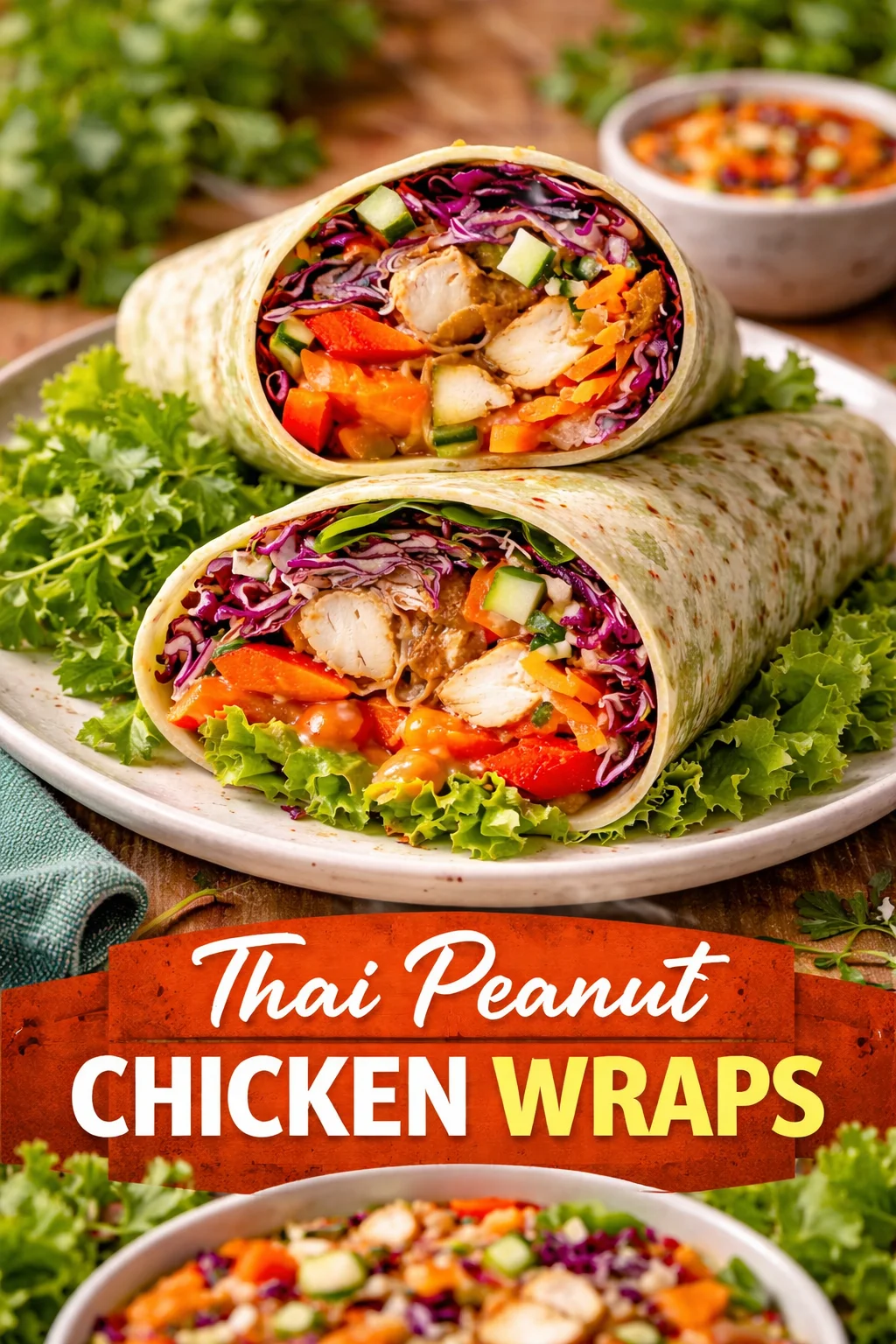 Delightful wraps filled with tender chicken, crunchy vegetables, and a creamy peanut sauce, perfect for a quick and healthy family dinner.